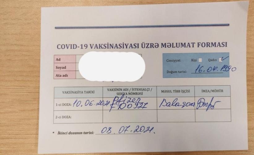 “Xəstəxanada peyvənd vurduran vətəndaşlara verilən COVID-19 vaksinasiyası üzrə məlumat formasında “Pfizer” peyvəndinin adı qeyd olunsa da, sistemdə məlumatlarını daxil etdikdə bildiriş çıxıb ki, sizə ilk doza “Sinovac” vaksini vurulub”.