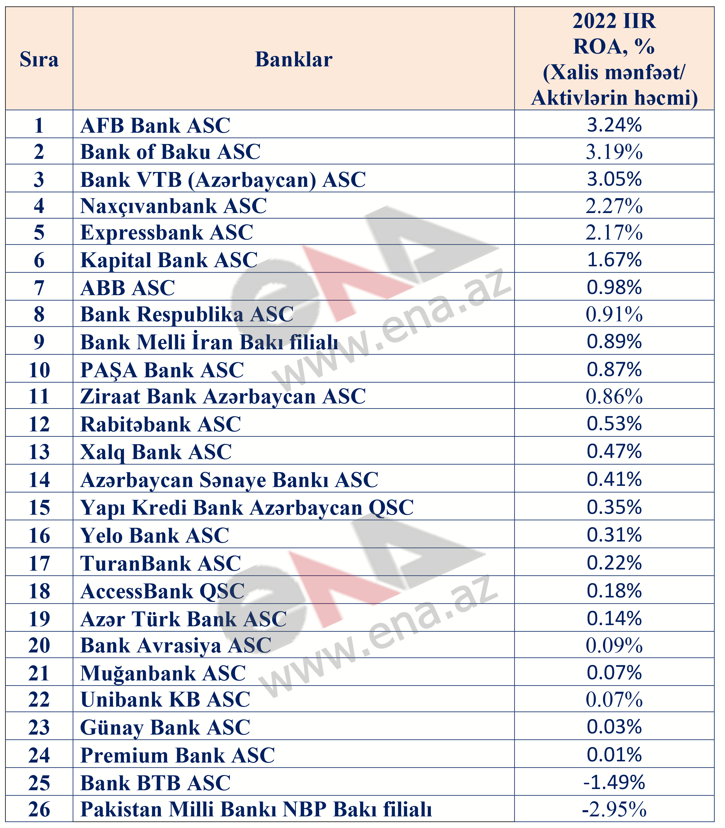 Cədvəldən görünür ki, öz aktivlərindən ən yaxşı gəlir götürən TOP-5 banklar bunlardır: AFB Bank, Bank of Baku, Bank VTB Azərbaycan, Naxçıvan Bank, Expressbank ASC.