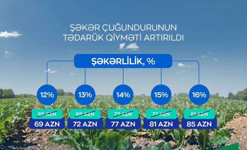 Bununla da şəkər çuğundurunun 1 tonunun alış qiyməti orta hesabla 12 % şəkərliliklə 65 manatdan 69 manata, 13 % şəkərliliklə 68 manatdan 72 manata, 14 % şəkərliliklə 73 manatdan 77 manata, 15% şəkərliliklə 77 manatdan 81 manata və 16% şəkərliliklə 81 manatdan 85 manata qaldırılıb.