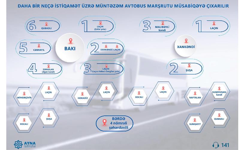 Rəqəmsal İnkişaf və Nəqliyyat Nazirliyi yanında Azərbaycan Yerüstü Nəqliyyat Agentliyi (AYNA) sərnişindaşıma xidmətinin keyfiyyətinin artırılması ilə bağlı tədbirlər çərçivəsində Bakı-Laçın, Bakı-Xankəndi-Laçın, Bakı-Cəbrayıl, Bakı-Zəngilan, Bakı-Qubadlı, Sumqayıt-Qubadlı, Mingəçevir-Laçın, Horadiz-Laçın, Xocalı-Şuşa, Xankəndi-Şuşa, Xankəndi-Malıbəyli, Xankəndi-Laçın, Xocalı-Laçın, Naftalan-Suqovuşan şəhərlərarası və Bərdə 4 nömrəli şəhərdaxili avtobus marşrutlarını müsabiqəyə çıxarıb.