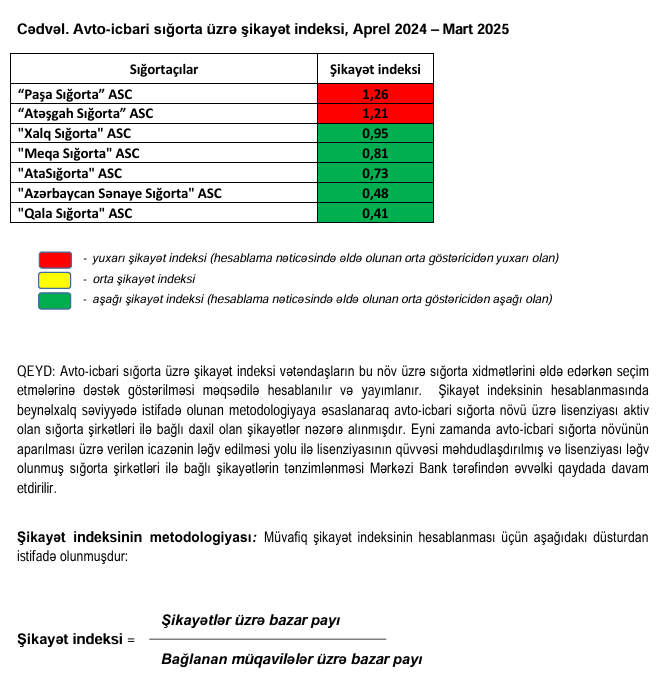 Azərbaycan Mərkəzi Bankı 2024 aprel–2025 mart dövrü üzrə avtomobil icbari sığorta sahəsində şikayət indeksi sığortaçılar üzrə müştəri məmnunluğunu əks etdirən əsas göstəriciləri açıqlanıb.