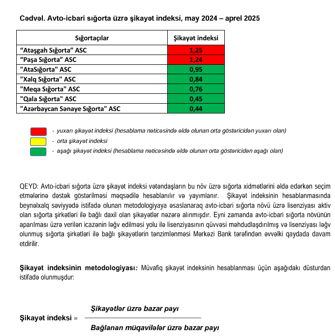 Azərbaycan Mərkəzi Bankı avto-icbari sığorta üzrə şikayət indeksini açıqlayıb.
