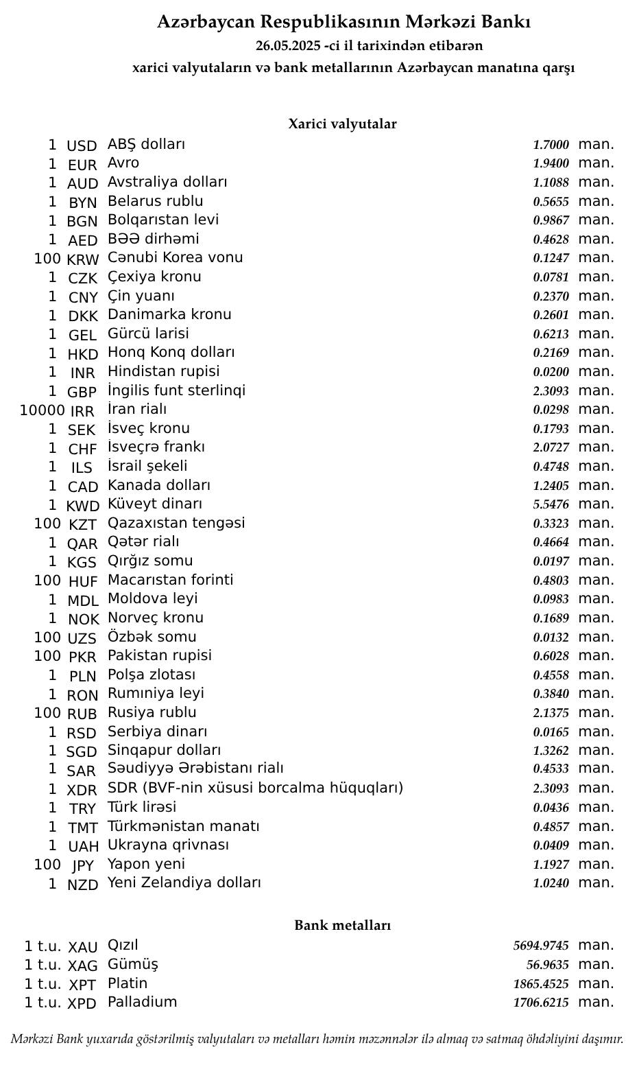 Günün valyuta məzənnələri (26.05.2025)