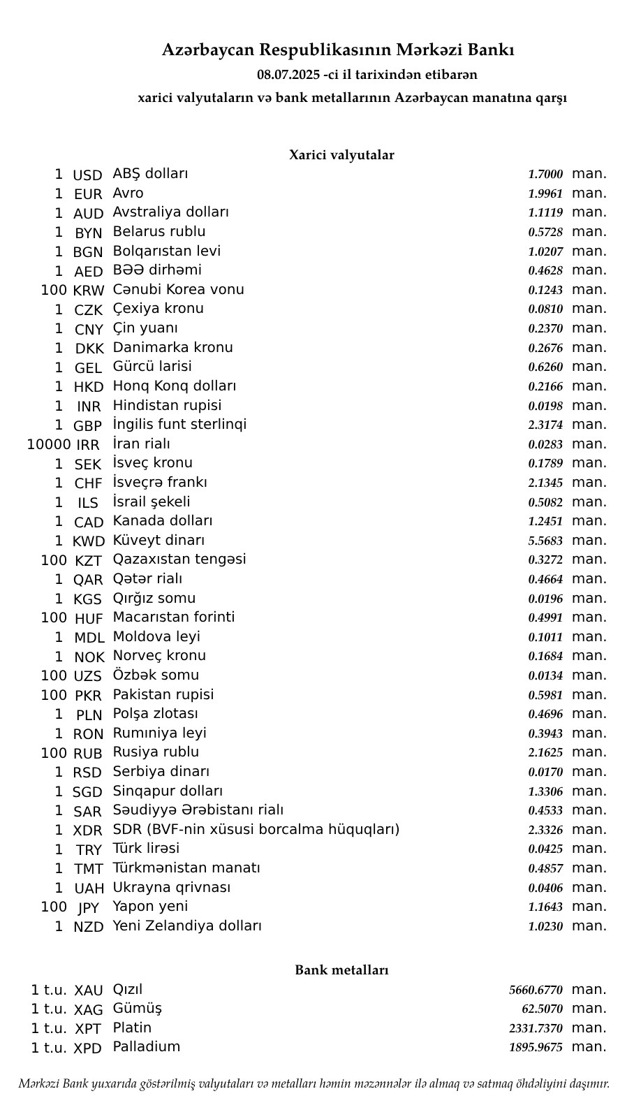 Günün valyuta məzənnələri (08.07.2025)