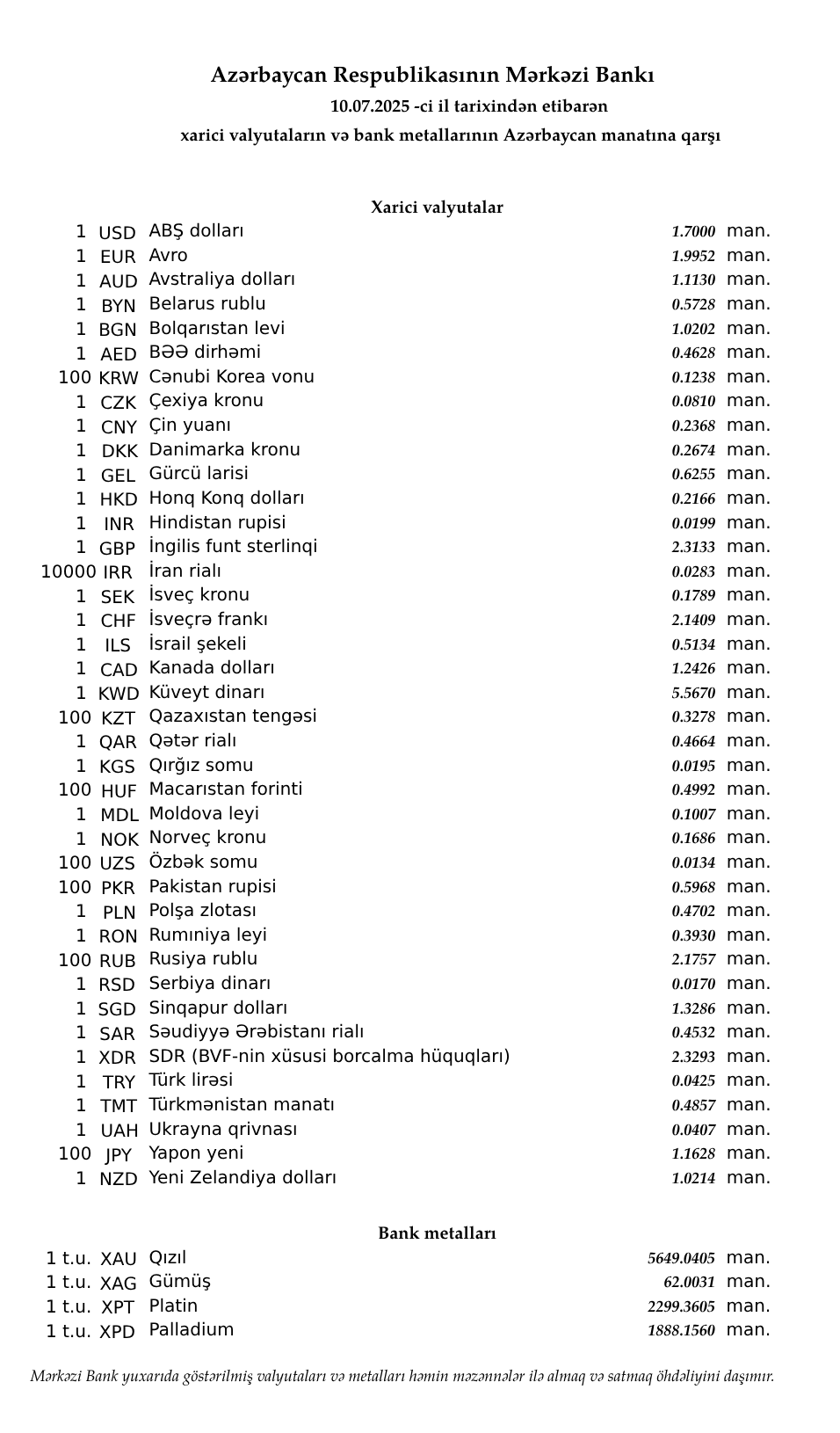 Azərbaycan Mərkəzi Bankının bu günə olan rəsmi valyuta məzənnələrinə əsasən, ABŞ dollarının məzənnəsi dəyişməyərək 1,7000 manat olub.