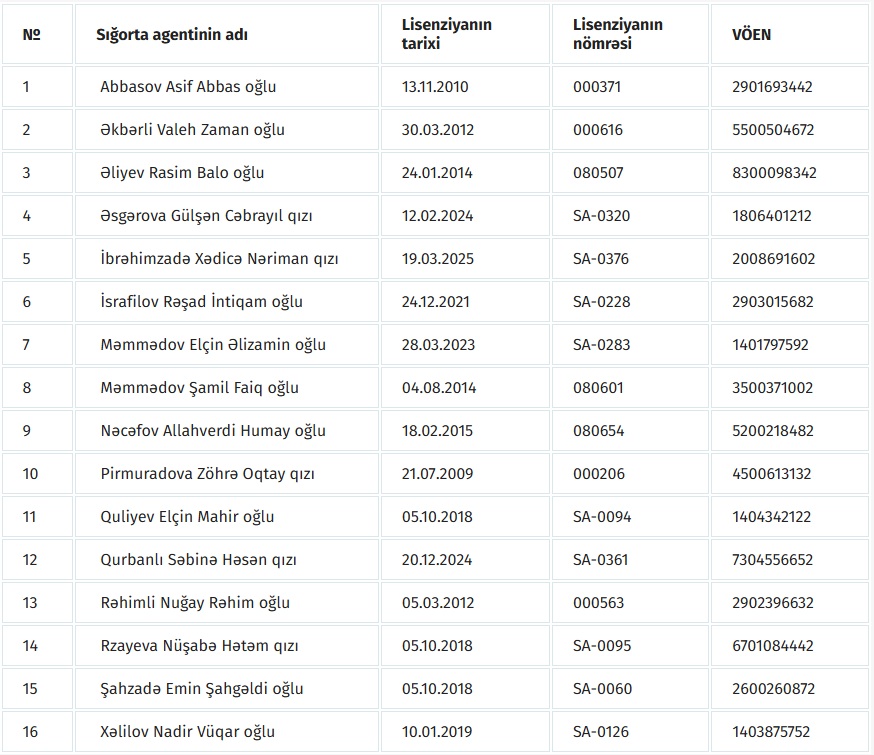 Azərbaycan Mərkəzi Bankı 16 fiziki şəxsə verdiyi sığorta agenti lisenziyasının qüvvəsinin 1 ay müddətinə dayandırılması barədə qərar qəbul edib.