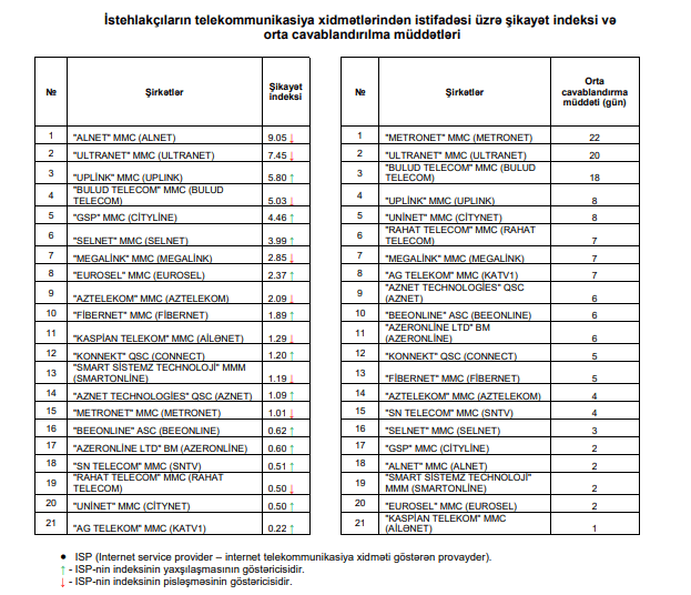 Azərbaycanın telekommunikasiya və poçt sahələrində tənzimləyici qurumu İnformasiya Kommunikasiya Texnologiyaları Agentliyi (İKTA) abunəçilərin internet xidmətlərindən istifadəsi üzrə növbəti şikayət indeksi və şikayətlərin orta cavablandırılma müddəti hesabatını dərc edib.