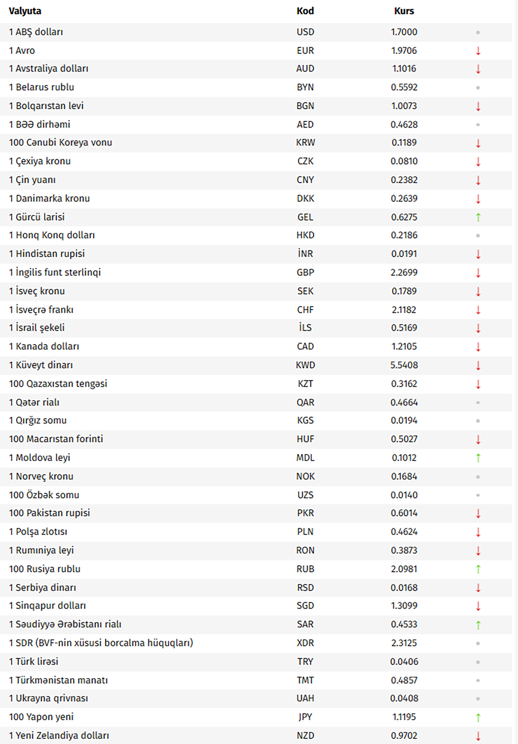 Azərbaycan Mərkəzi Bankının bu günə olan rəsmi valyuta məzənnələrinə əsasən, ABŞ dollarının məzənnəsi dəyişməyərək 1,7000 manat olub.