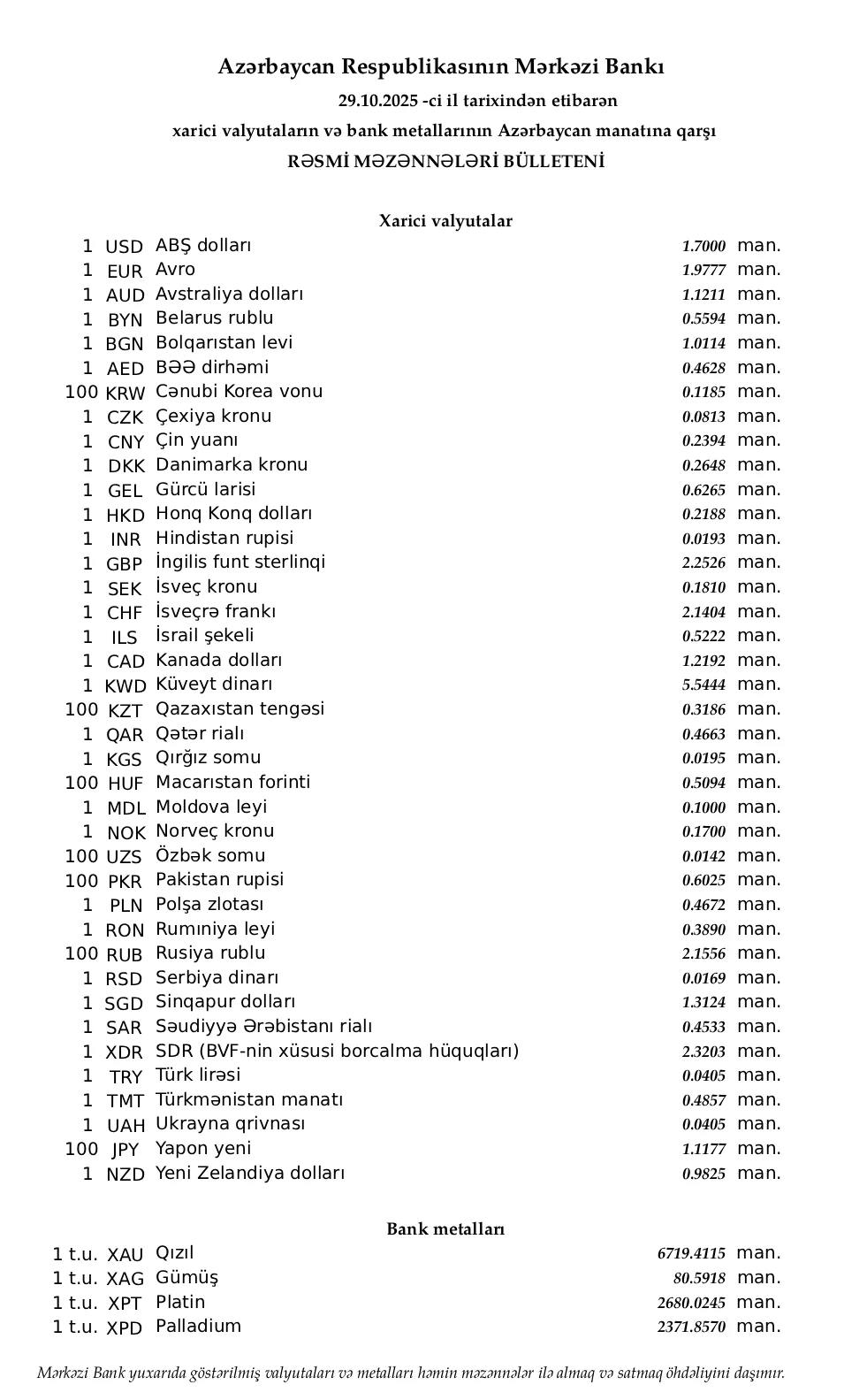 Günün valyuta məzənnələri (29.10.2025)