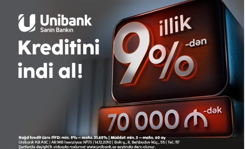 Unibank nağd kredit şərtlərini yeniləyib. İndi bankda nağd kreditlər illik 9%-dən başlayır, kredit üzrə maksimum məbləğ isə 70 000 manatadək artırılıb.