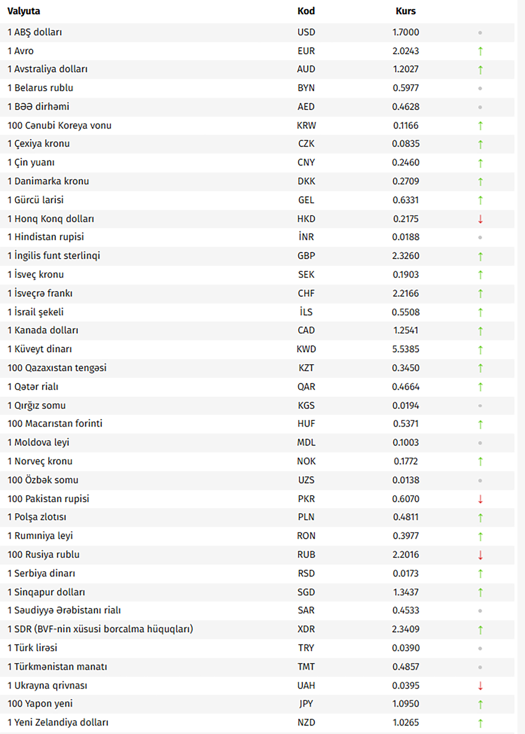 Azərbaycan Mərkəzi Bankının bu günə olan rəsmi valyuta məzənnələrinə əsasən, ABŞ dollarının məzənnəsi dəyişməyərək 1,7000 manat olub.