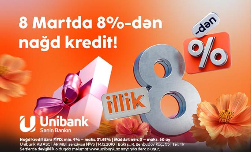 Unibank 8 Mart Beynəlxalq Qadınlar Günü münasibəti ilə Azərbaycan xanımlarını təbrik edir, uğurlar arzulayır. Bank xanımlar üçün “8 Martda 8 %” bayram kampaniyası keçirir. Martın 5-dən 7-dək davam edən kampaniya müddətində xanım müştərilər nağd krediti illik 8 %-dən başlayan faizlə rəsmiləşdirə bilərlər. Üç gün ərzində “Unibank”a müraciət edən xanım müştərilər 70 000 manatadək nağd krediti 60 ayadək müddətə sərfəli şərtlərlə əldə edə biləcəklər.