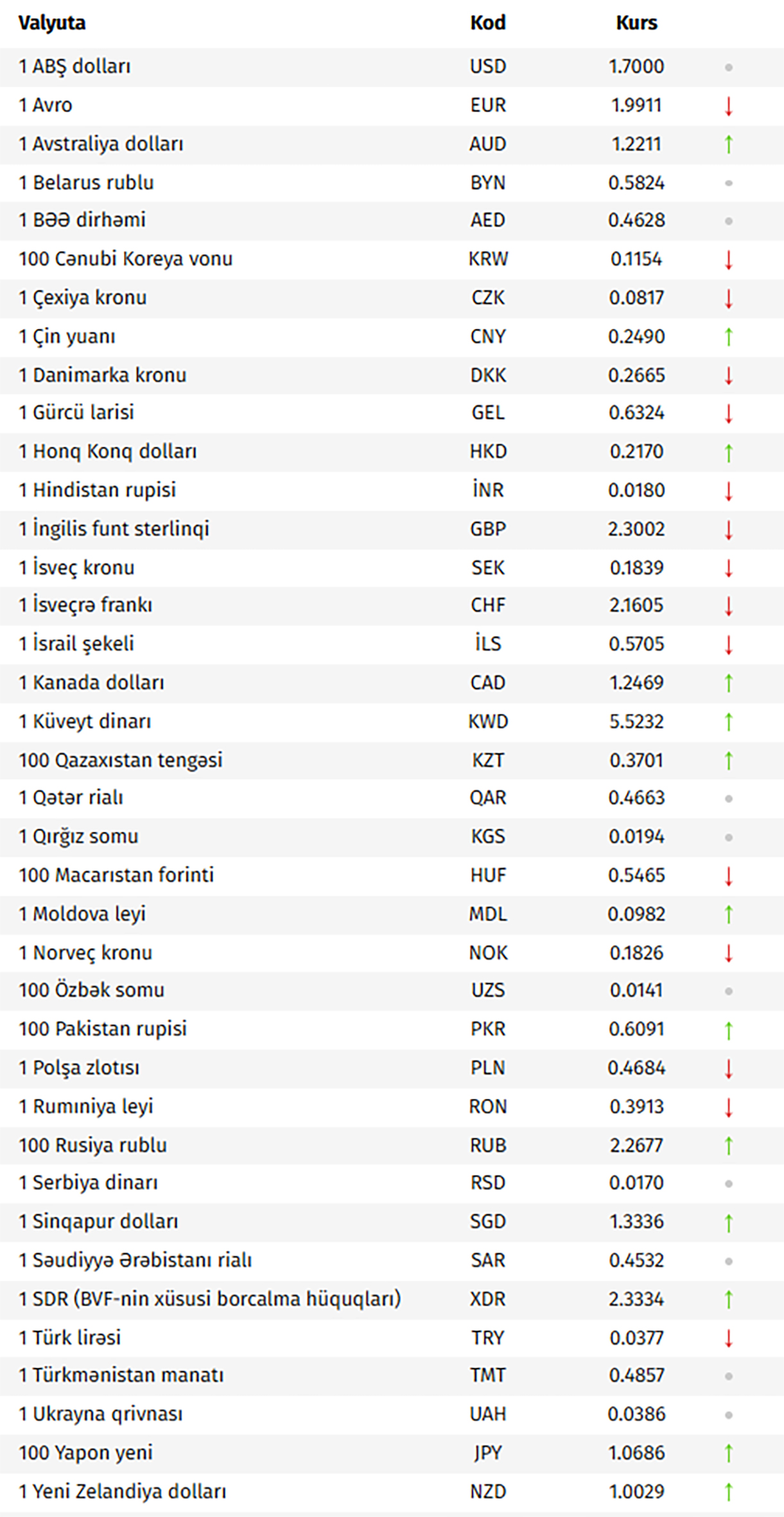 Azərbaycan Mərkəzi Bankının bu günə olan rəsmi valyuta məzənnələrinə əsasən, ABŞ dollarının məzənnəsi dəyişməyərək 1,7000 manat olub.
