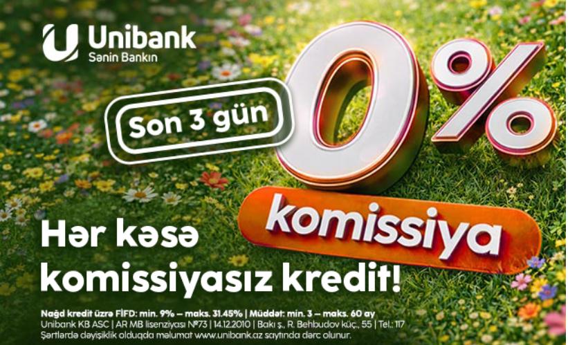 Unibank 3 gün davam edən sərfəli kredit kampaniyası keçirir. Bütün peşə sahibləri bu kampaniyadan faydalana bilər. Aprelin 28-dən 30-dək “Unibank”da nağd kreditlər 0 % komissiyalıdır. 3 gün ərzində bankın filiallarına gələrək və yaxud onlayn kanallarla müraciət etməklə, 70 000 manatadək krediti komissiyasız əldə edə bilərsiniz.